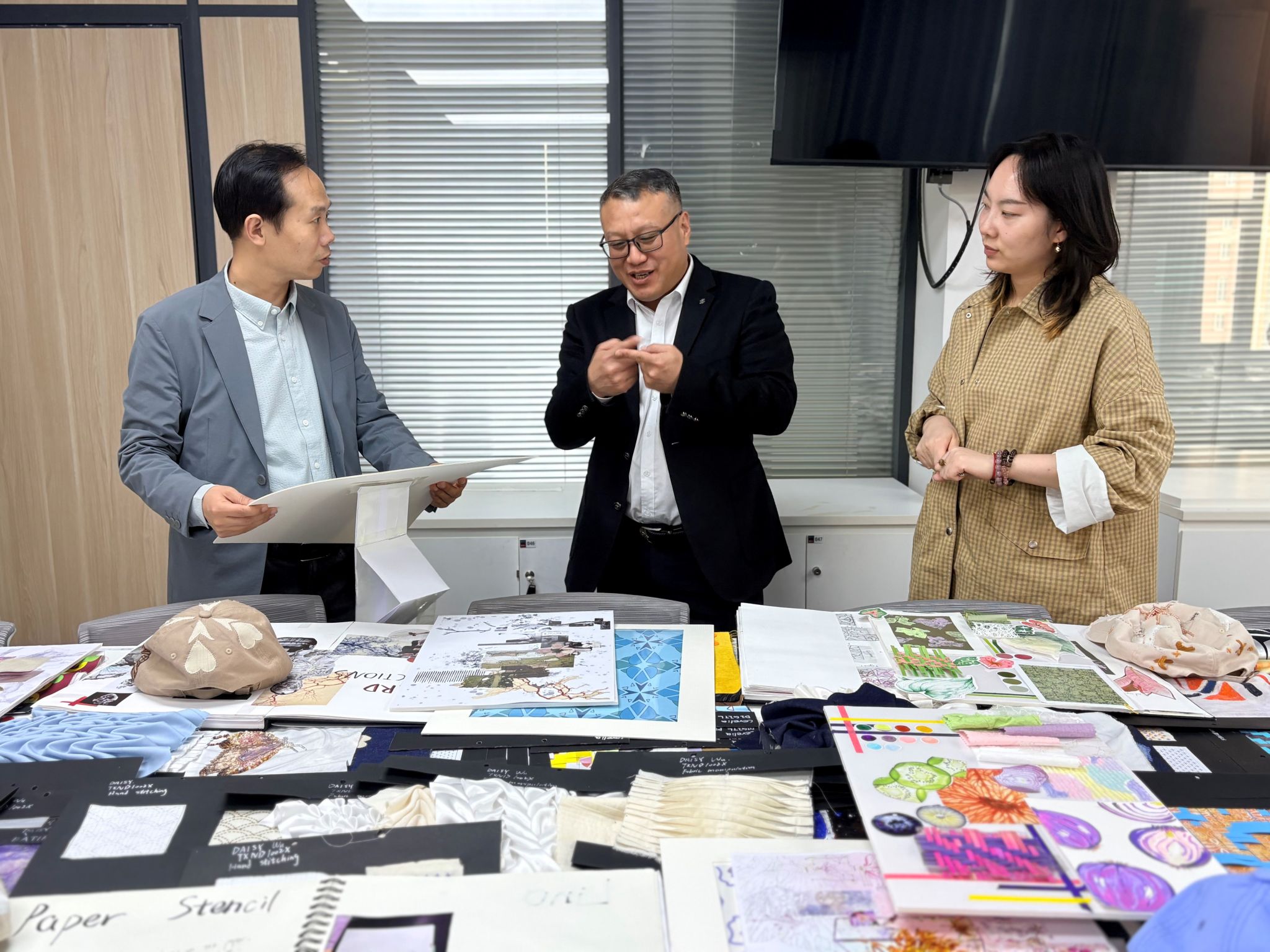 中外合作办学项目2024级全体学生面料再造课程作业展顺利举办。副校长杨建亲临展览现场指导,仔细观看了学生作品,并就课程教学、学生专业发展及中外合作办学项目的未来规划提出宝贵建议。