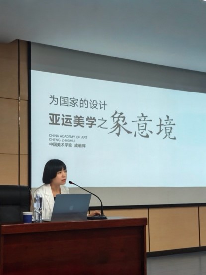 讲座伊始,成朝晖教授直击当前师生在设计实践中常常遇到的核心痛点——“如何深度挖掘传统文化,并将其有效地转化为符合时代审美的创新设计”。随后,她以亲身参与的杭州亚运会视觉设计为核心案例,围绕“象·意·境”三个维度,深度分享了亚运美学的创意思维与破局经验。成教授生动阐释了亚运核心图形“润泽”及整体形象景观系统的创作历程,详细拆解了如何立足东方文化基因,将传统墨韵巧妙融入现代设计语言。她指出,杭州亚运会正是以“东方诗意、中国窗口”的美学定位,通过统一的视觉叙事系统,从核心图形到场馆、城市、传播,成功构建出了兼具深厚文化底蕴与鲜明时代精神的国家形象。